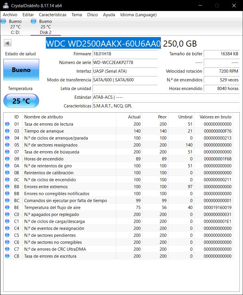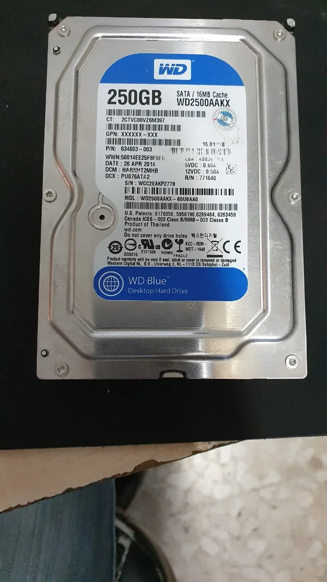 Disco duro 250GB, marca Western Digital, 8040 horas de funcionamiento, Firmware 18.01H18, Número de serie WD-WCC2EAKP2778, sin particiones, formateado a bajo nivel, compatible con PC, En perfecto estado de funcionamiento, libre de errores. Precio no negociable Se hacen envios Para cualquier duda pregunta sin compromiso. 33.