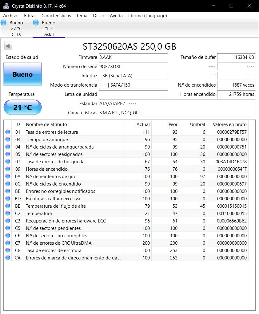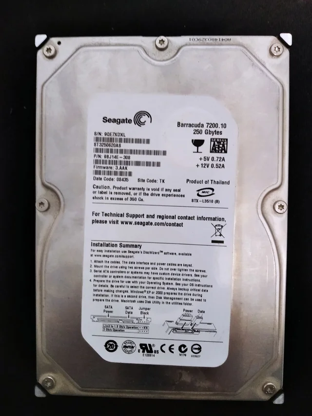 Disco duro de 3,5″ de capacidad 250GB, marca Seagate, 21759 horas de funcionamiento, sin particiones, formateado a bajo nivel, compatible con PC. En perfecto estado de funcionamiento, libre de errores.